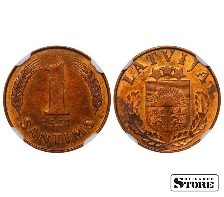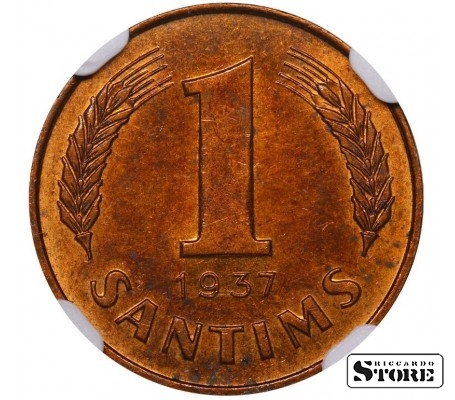 Bronze 1 Santims coin of the Latvian Republic, issued in 1937 during the First Republic period (1922–1940). It is a standard circulation issue: the obverse shows the lesser coat of arms of Latvia above oak branches, while the reverse features the denomination dividing sprigs above the date. The coin weighs 1.8 g, has a diameter of 17 mm and is catalogued as KM#10. This example is certified by NGC with the grade UNC DETAILS (Uncirculated Details).