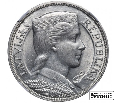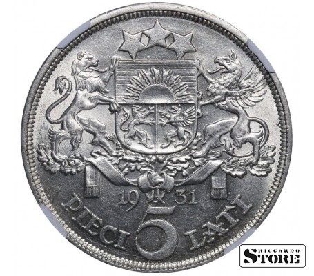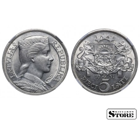 Silver 5 Lati coin of the Latvian Republic dated 1931, a standard circulation issue of the First Republic series (1929–1932). The obverse shows a young woman in traditional headwear with the legend “LATVIJAS REPUBLIKA”; the reverse features Latvia’s large coat of arms above the denomination and date, and the edge bears the inscription “DIEVS *** SVETI *** LATVOJU ***”. Struck in .835 silver, the coin weighs 25.00 g and measures 37 mm in diameter, catalogued as KM#9. This example is certified by NGC and graded MS 61.