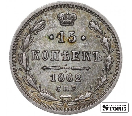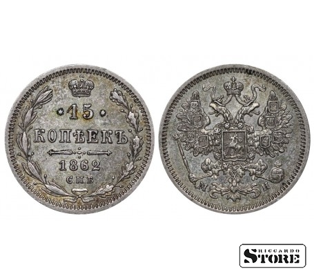 Russian Empire coin with a denomination of 15 Kopecks, issued in 1862 during the reign of Emperor Alexander II (1855–1881). Composition — silver, weight 3.06 g.