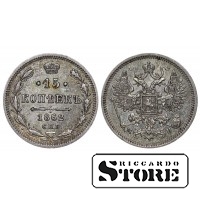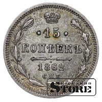 Russian Empire coin with a denomination of 15 Kopecks, issued in 1862 during the reign of Emperor Alexander II (1855–1881). Composition — silver, weight 3.06 g.