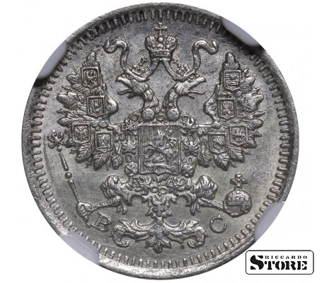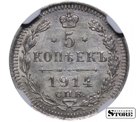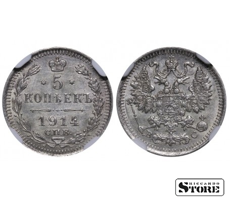 Russian Empire coin with a denomination of 5 Kopecks, issued in 1914 during the reign of Emperor Nicholas II (1894–1917). Composition — silver, weight 0.9 g. Certified by NGC with a grade of UNC DETAILS.