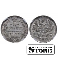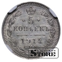 Russian Empire coin with a denomination of 5 Kopecks, issued in 1914 during the reign of Emperor Nicholas II (1894–1917). Composition — silver, weight 0.9 g. Certified by NGC with a grade of UNC DETAILS.