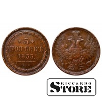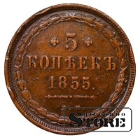 Russian Empire coin with a denomination of 5 Kopecks, issued in 1855 during the transitional period between the reigns of Nicholas I (1825–1855) and Alexander II (1855–1881). Composition — copper, weight 25.59 g.