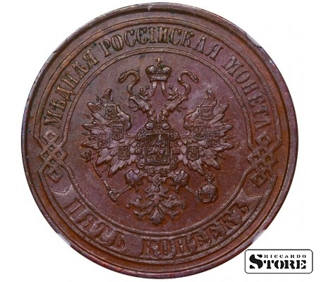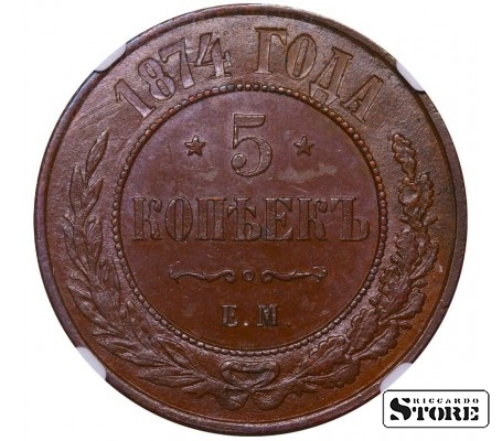 Russian Empire, 5 Kopecks 1874 EM, Alexander II, Copper, NGC MS 62 BN