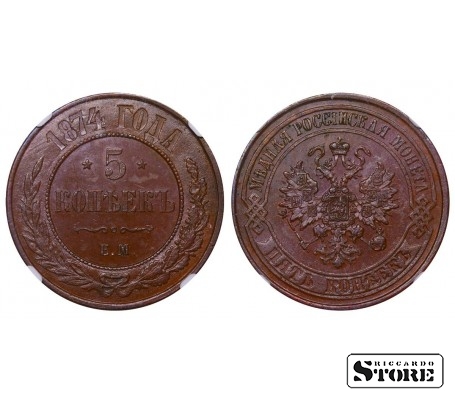 Copper 5 Kopecks coin of the Russian Empire dated 1874, struck at the Ekaterinburg Mint (mintmark “EM/ЕМ”). It belongs to the regular circulation type of Alexander II’s copper series (type dated 1867–1876). Obverse: Imperial double-headed eagle; reverse: denomination and date within a wreath. Composition: copper, reeded edge. Standard specs: 16.38 g weight, 32.7 mm diameter; WWC number Y#12.1 / KM-Y12.1, also referenced as Bitkin #399. This example is certified by NGC as MS 62 BN (Mint State 62, Brown).