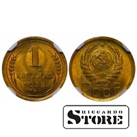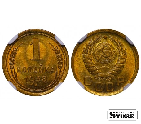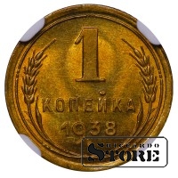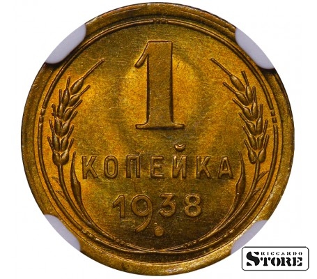 SSRS moneta su 1 kapeikos nominalu, išleista 1938 m. Būklė MS 66, medžiaga — aliuminio-bronzos lydinys. Svoris 1 g, skersmuo 15,2 mm, briaunuotas kraštas. Įprasta cirkuliacijos moneta Stalino laikais.