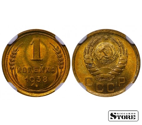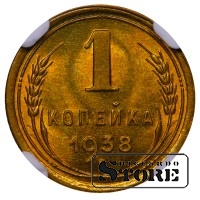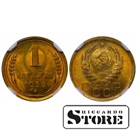 SSRS moneta su 1 kapeikos nominalu, išleista 1938 m. Būklė MS 66, medžiaga — aliuminio-bronzos lydinys. Svoris 1 g, skersmuo 15,2 mm, briaunuotas kraštas. Įprasta cirkuliacijos moneta Stalino laikais.