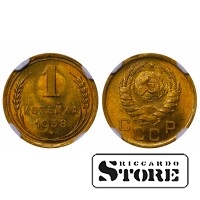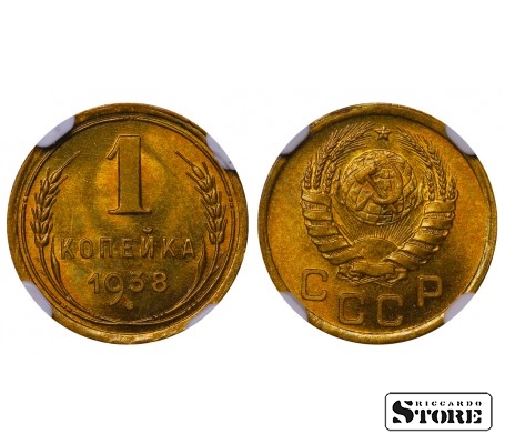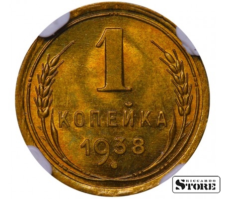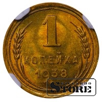 SSRS moneta su 1 kapeikos nominalu, išleista 1938 m. Būklė MS 66, medžiaga — aliuminio-bronzos lydinys. Svoris 1 g, skersmuo 15,2 mm, briaunuotas kraštas. Įprasta cirkuliacijos moneta Stalino laikais.