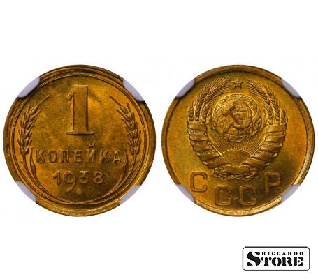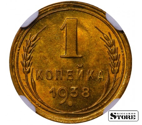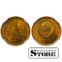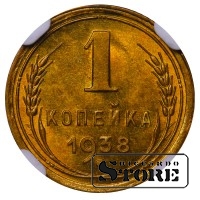 SSRS moneta, kurios nominalas 1 kapeika, išleista 1938 m. Būklė MS 65, medžiaga — aliuminio-bronzos lydinys. Svoris 1 g, skersmuo 15.2 mm. Standartinė apyvartos moneta.