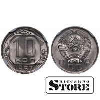 SSRS 10 kapeikų moneta, išleista 1957 m. Būklė MS 64, medžiaga — vario-nikelio lydinys. Skersmuo 17,27 mm, svoris 1,8 g. Standartinė apyvartos moneta, monetos orientacija ↑↑.