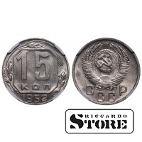 Sovietų Sąjungos 15 kapeikų moneta, išleista 1952 m. Būklė MS 63, medžiaga — varinis-nikelinis lydinys. Skersmuo 19,56 mm, svoris 2,7 g. Standartinė apyvartos moneta, monetos orientacija ↑↑.