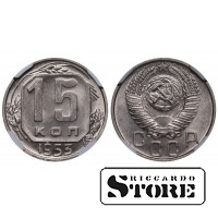 Sovietų Sąjungos 15 kapeikų moneta, išleista 1953 m. Būklė MS 63, medžiaga — vario ir nikelio lydinys. Svoris 2,7 g, skersmuo 19,56 mm. Standartinė apyvartos moneta, briaunuotu kraštu.