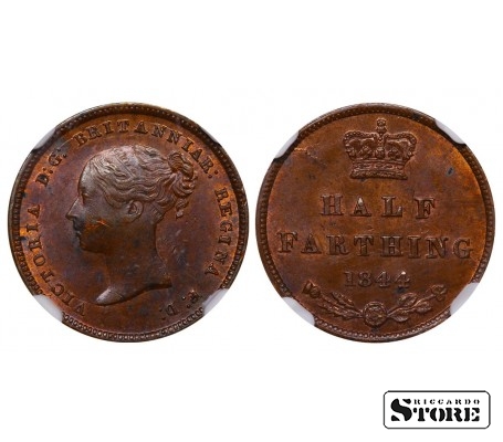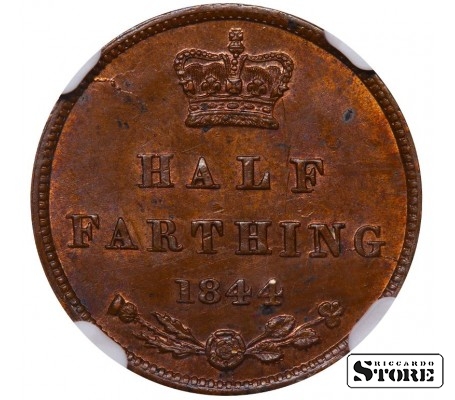 Jungtinės Karalystės ½ farthing moneta, išleista 1844 m. Būklė MS 62 BN, medžiaga — varis. Skersmuo 18 mm, svoris 2,36 g. Standartinė apyvartos moneta, monetos orientacija ↑↑.