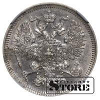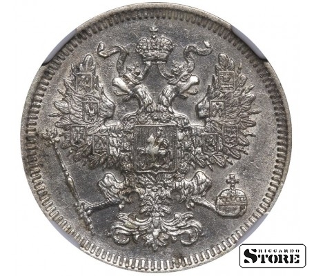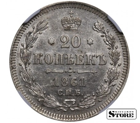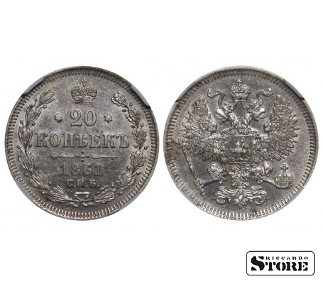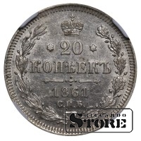 Rusijos Imperijos moneta, kurios nominalas 20 kapeikų, išleista 1861 m. imperatoriaus Aleksandro II (1855–1881) valdymo laikais. Kaldykla — SPB (Sankt Peterburgo kaldykla). Medžiaga — sidabras, svoris 4,08 g. Būklė NGC UNC DETAILS. Katalogo numeriai: Y#22.2, Bitkin 288.