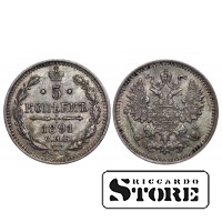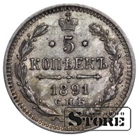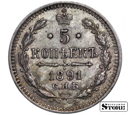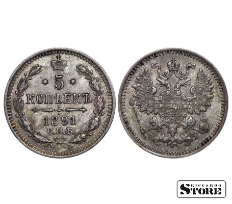 Rusijos Imperijos moneta, kurios nominalas 5 kapeikų, išleista 1891 m. imperatoriaus Aleksandro III (1881–1894) valdymo laikais. Medžiaga — sidabras, svoris 0,9 g.