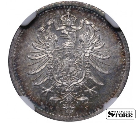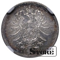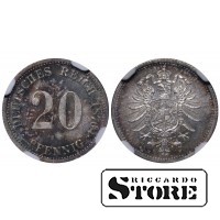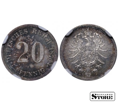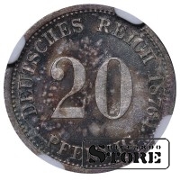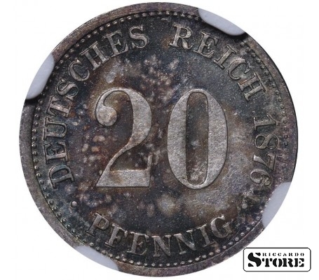 Vokietijos imperijos moneta su nominalu 20 pfeningų, kaldinta 1876 m. Hanoverio (H) kalykloje. Būklė MS 64, “Top Pop” (vienas geriausių populiacijoje), sudėtis — sidabras 0,900. Svoris 5,56 g, skersmuo 22,50 mm, kraštas raižytas. Klasikinis sidabrinis nominalas Vilhelmo I laikais.