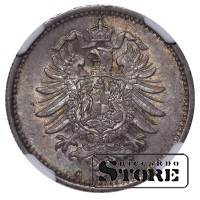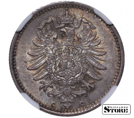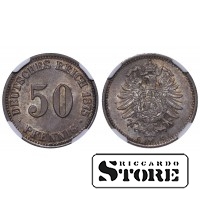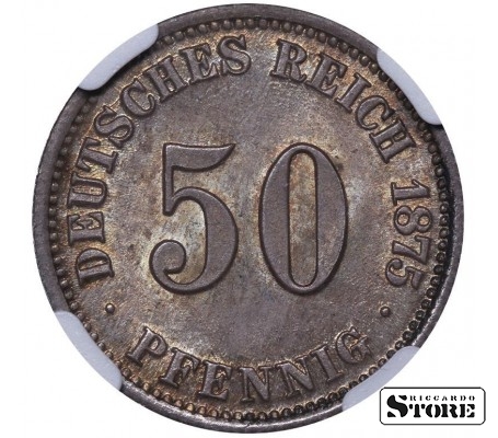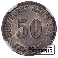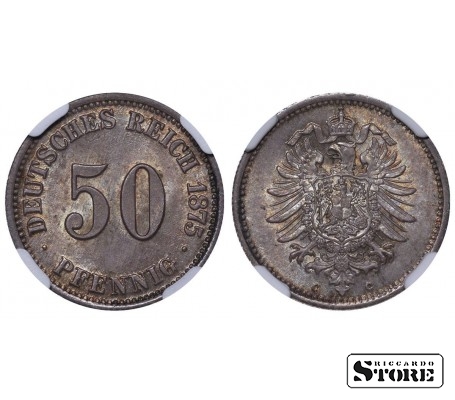 Vokietijos imperijos moneta su nominalu 50 pfeningų, kaldinta 1875 m. Frankfurto (C) kalykloje. Būklė MS 64, metalo sudėtis — sidabras 0,900. Svoris 2,78 g, skersmuo 20,00 mm, kraštas raižytas. Elegantiškas istorinis egzempliorius.