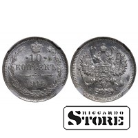 Монета Российской Империи номиналом 10 копеек, выпущенная в 1915 году в период правления императора Николая II (1894–1917). Материал — серебро, вес 1,8 г. Сертифицирована NGC с высшей оценкой MS 66. Отлично сохранившийся экземпляр с превосходным блеском и чётким чеканом. Коллекционный выпуск конца Российской Империи.