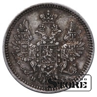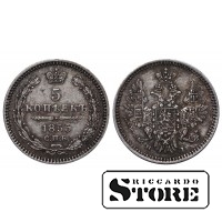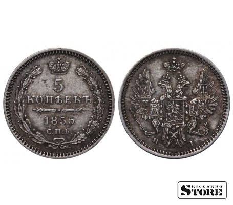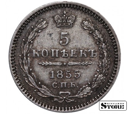 Монета Российской Империи номиналом 5 копеек, выпущенная в 1855 году — в переходный период между правлением Николая I (1825–1855) и Александра II (1855–1881). Материал — серебро, вес 1,04 г.